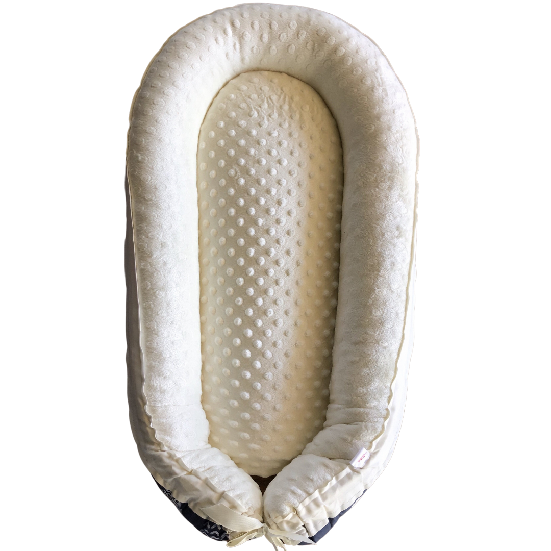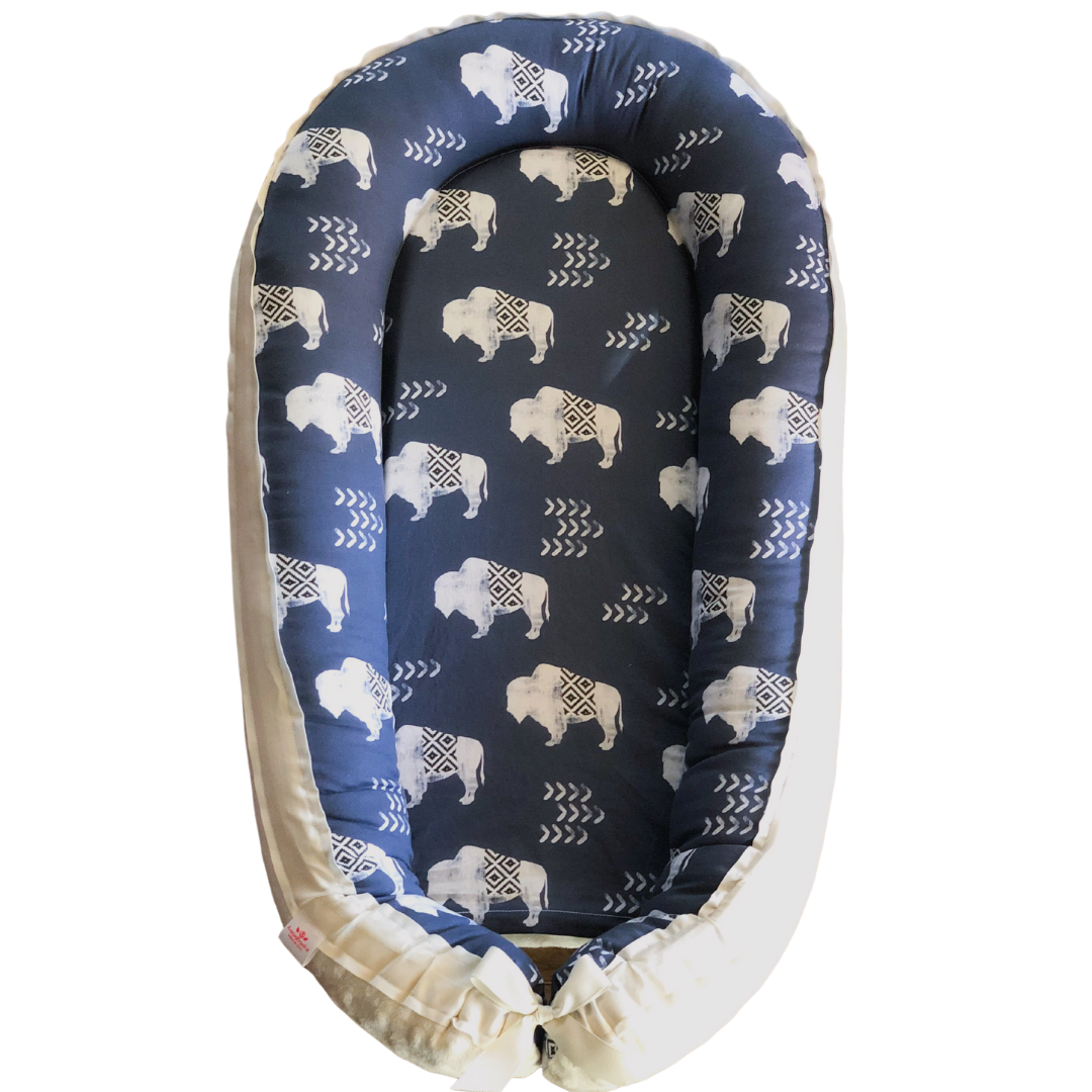 Give your little one a cozy place to lounge with our handmade Baby Nest. Thoughtfully designed to mimic the comforting feel of the womb, this nest creates a soft and secure spot for supervised awake time only. It’s reversible, featuring a custom-printed eco-friendly cotton fabric on one side and ultra-soft minky on the other. The bottom is secured with Velcro for easy removal of the mattress insert when it’s time to wash. Each Baby Nest is handmade and filled with hypoallergenic polyester fibers for comfort and support.