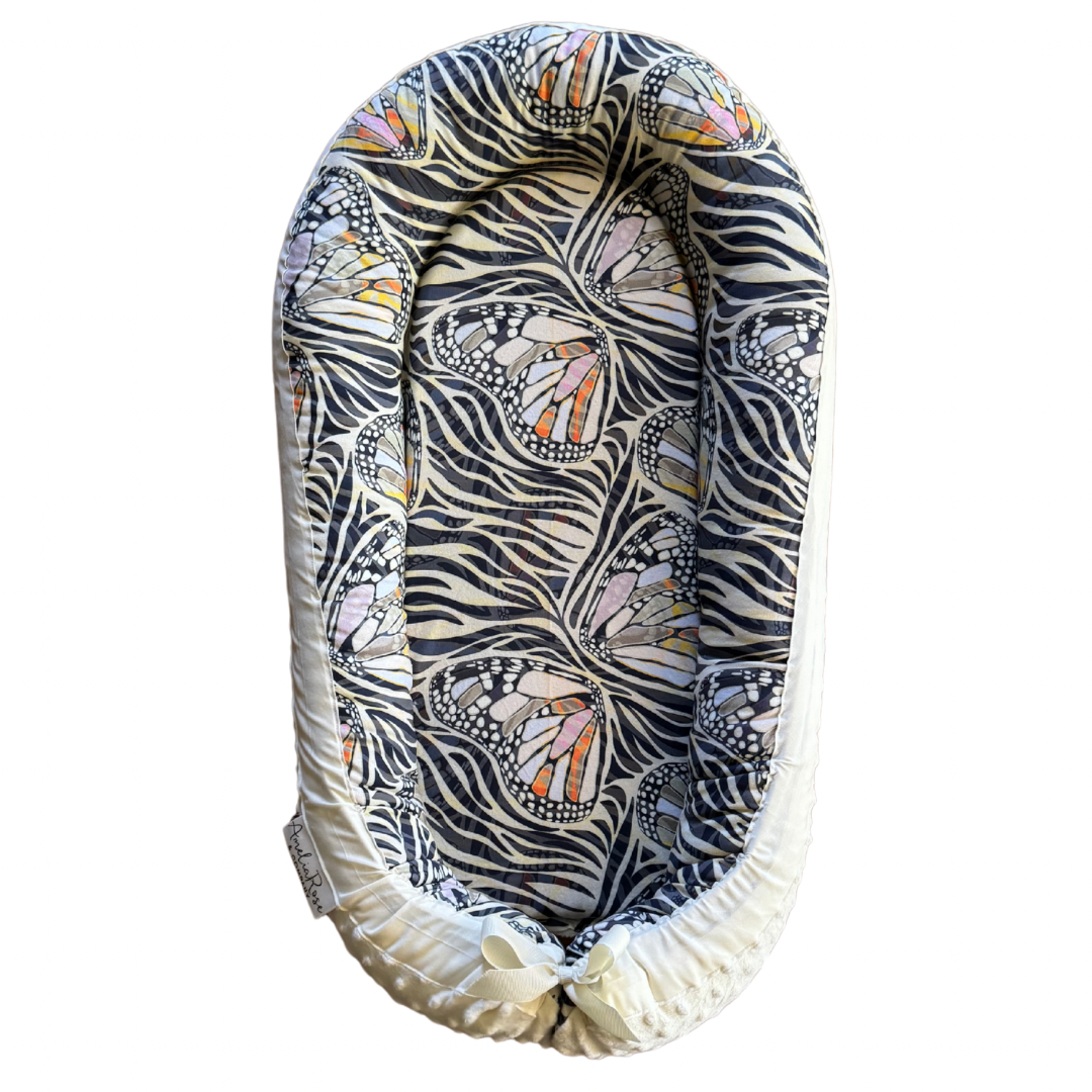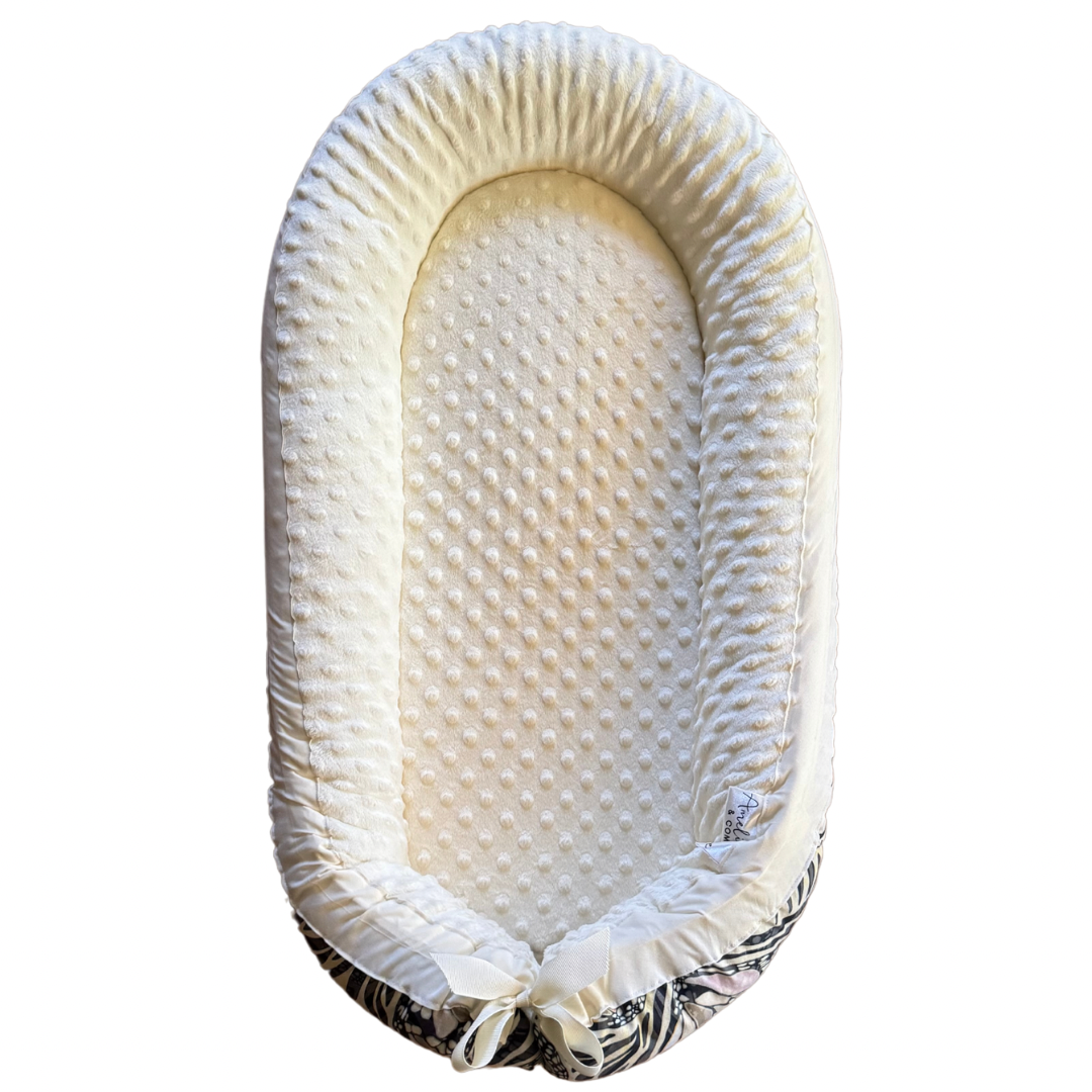 Give your little one a cozy place to lounge with our handmade Baby Nest. Thoughtfully designed to mimic the comforting feel of the womb, this nest creates a soft and secure spot for supervised awake time only. It’s reversible, featuring a custom-printed eco-friendly cotton fabric on one side and ultra-soft minky on the other. The bottom is secured with Velcro for easy removal of the mattress insert when it’s time to wash. Each Baby Nest is handmade and filled with hypoallergenic polyester fibers for comfort and support.