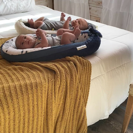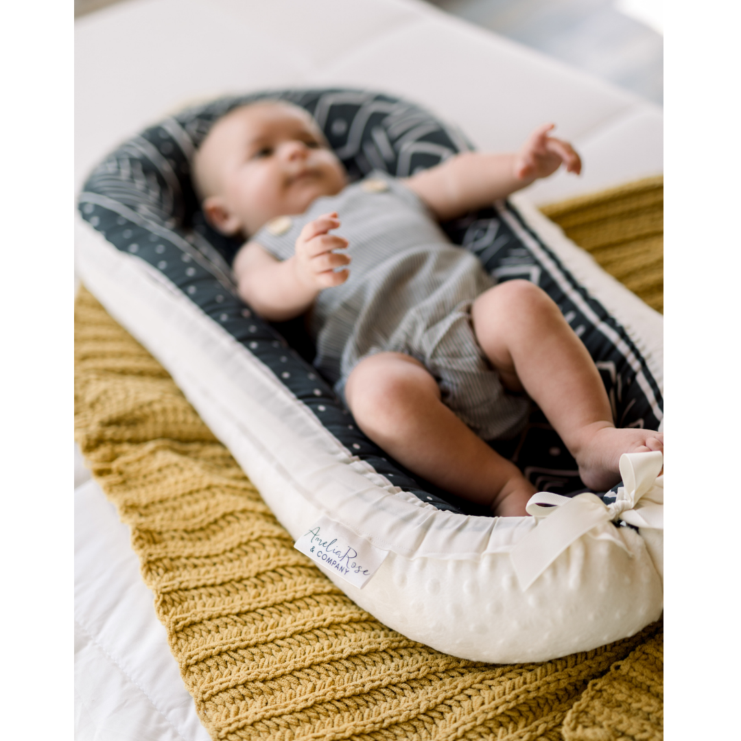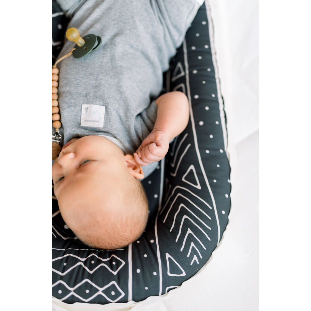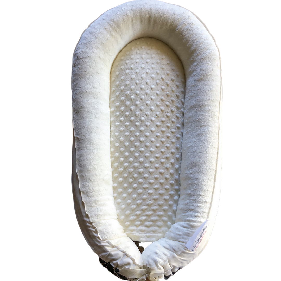 Give your little one a cozy place to lounge with our handmade Baby Nest. Thoughtfully designed to mimic the comforting feel of the womb, this nest creates a soft and secure spot for supervised awake time only. It’s reversible, featuring a custom-printed eco-friendly cotton fabric on one side and ultra-soft minky on the other. The bottom is secured with Velcro for easy removal of the mattress insert when it’s time to wash. Each Baby Nest is handmade and filled with hypoallergenic polyester fibers for comfort and support.