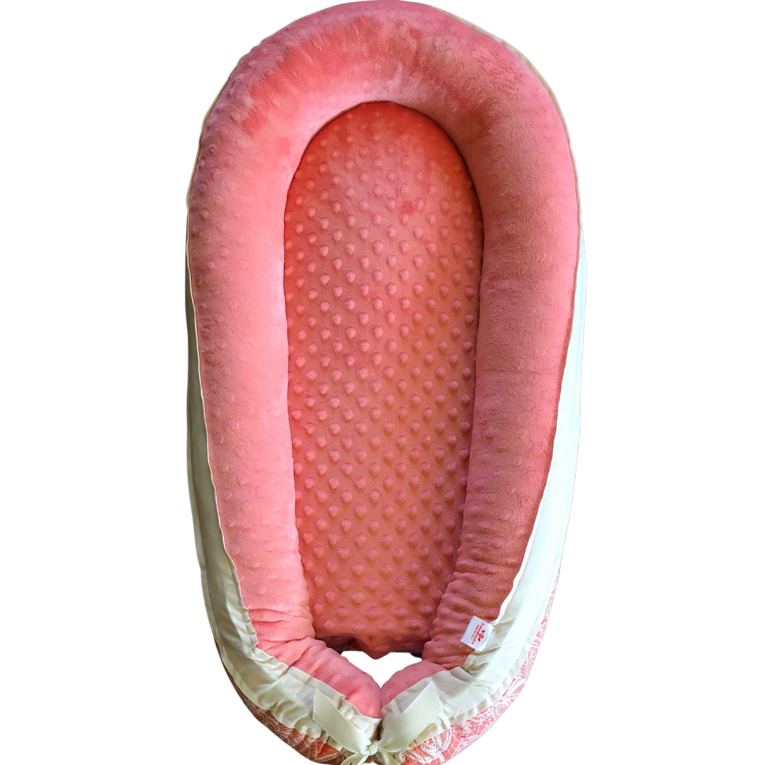 Give your little one a cozy place to lounge with our handmade Baby Nest. Thoughtfully designed to mimic the comforting feel of the womb, this nest creates a soft and secure spot for supervised awake time only. It’s reversible, featuring a custom-printed eco-friendly cotton fabric on one side and ultra-soft minky on the other. The bottom is secured with Velcro for easy removal of the mattress insert when it’s time to wash. Each Baby Nest is handmade and filled with hypoallergenic polyester fibers for comfort and support.