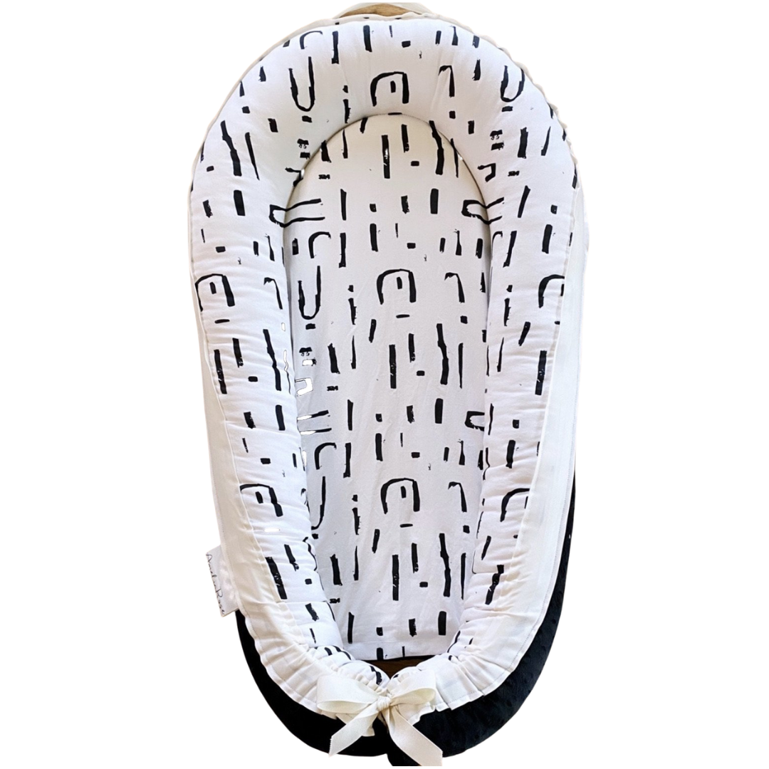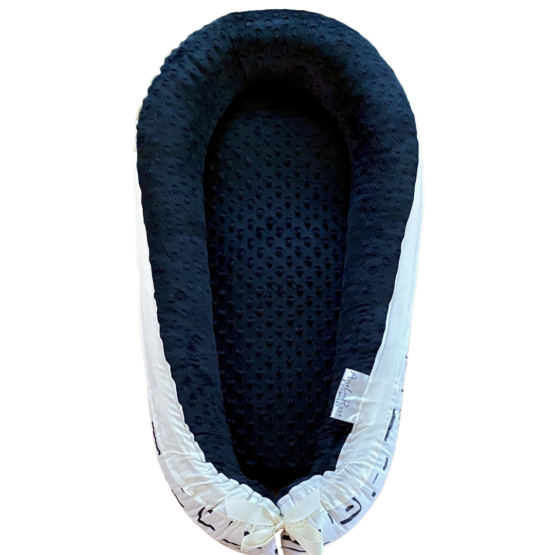 Give your little one a cozy place to lounge with our handmade Baby Nest. Thoughtfully designed to mimic the comforting feel of the womb, this nest creates a soft and secure spot for supervised awake time only. It’s reversible, featuring a custom-printed eco-friendly cotton fabric on one side and ultra-soft minky on the other. The bottom is secured with Velcro for easy removal of the mattress insert when it’s time to wash. Each Baby Nest is handmade and filled with hypoallergenic polyester fibers for comfort and support.
